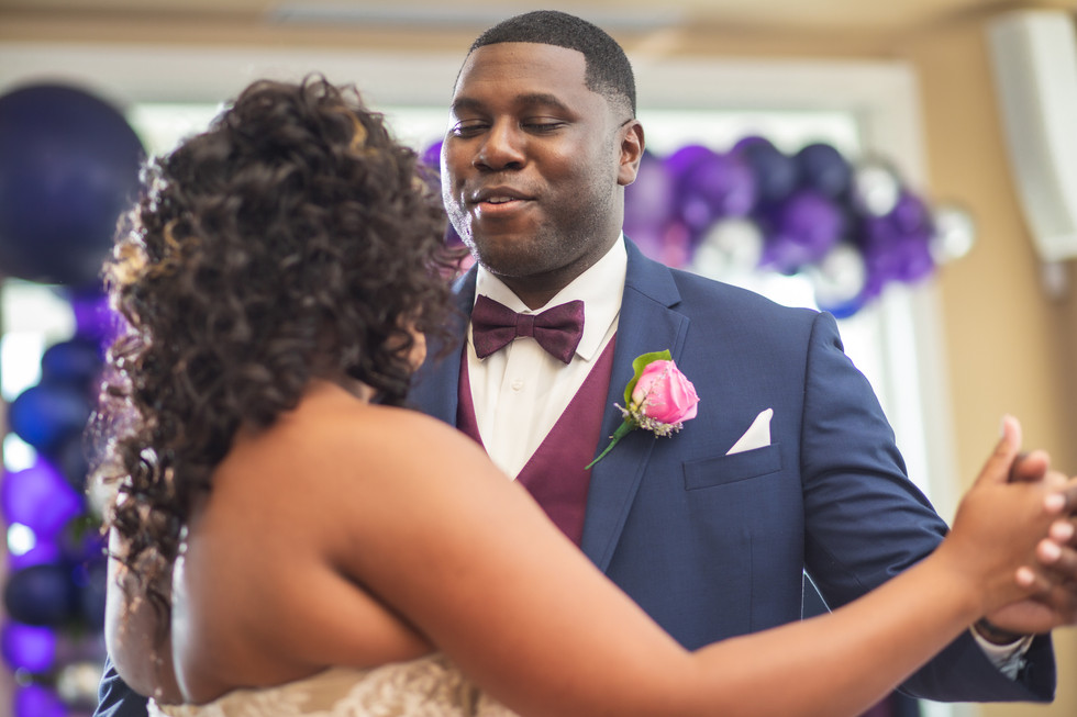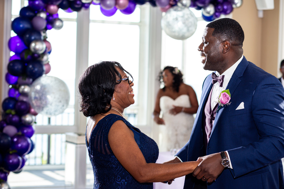 Our colors were purple, blue and grey hues. We wanted an earthy, natural feel so there was a lot of greenery and flowers by Basket and Bows in Tasley, Va. to accent the scenes of the Chesapeake Bay. We loved the balloon garland by B. Pilar Events that accented certain parts of our reception, like our cake and the table seating chart.